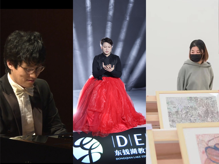 左:《致秋天——王加阳音画音乐会》,中:手势舞《心上的罗加》,右:《众妙之门——走进原生艺术世界》绘画展览