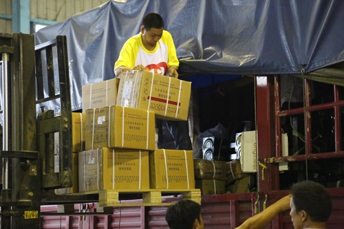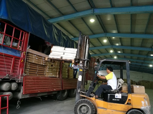彩虹工作人员在搬运物资并装车