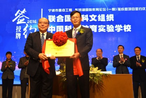 在2016年12月18日宁波市重点工程·国际教育论坛(一期)落成暨项目签约仪式上,宁波华茂外国语学校被授予中国首家“联合国教科文组织·中国科创教育实验学校”。1月14日,徐总裁把这块象征着华茂教育国际化大发展的牌匾,移交给宁波华茂外国语学校。
