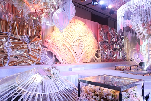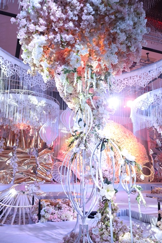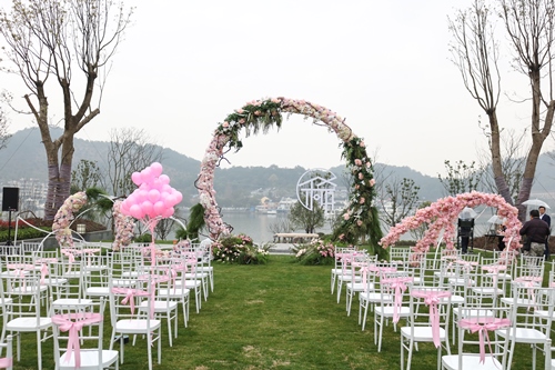 据了解,此次「稀」潮流婚礼发布会,把宁波东钱湖华茂希尔顿度假酒店室内1170平方米、层高8米的无柱式大宴会厅作为婚礼主秀场,并在场外设置逾千坪的优雅草坪,衬出东钱湖的明媚优雅。场外鲜花簇拥纯白座椅,浪漫粉色的主背景框出远处亮丽景致,花团景簇的西式婚礼摆台,更令人心生向往。