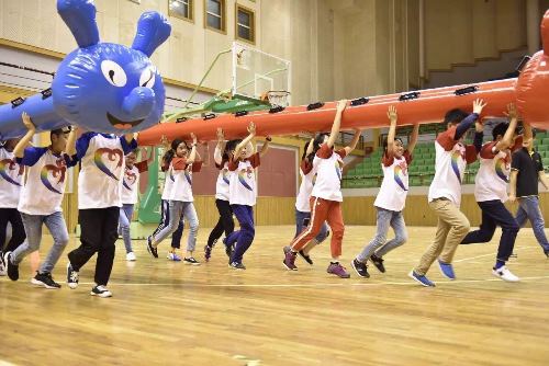 在阳光下奔跑的华外学生们活力满满,今天他们将特色项目足球设计成海选游戏“足球宝背”,考验灵活性的同时,更考验了队员之间的信任和配合。通过第一关的足球游戏,三位评委老师选出了表现最棒的20名同学。