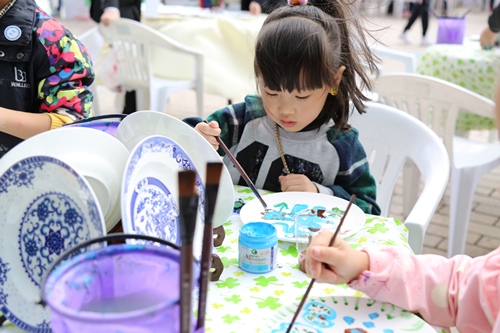 在活动现场,“瓷器彩绘”是小朋友们参与度最高的活动内容之一。青瓷以瓷质细腻,线条明快流畅、造型端庄浑朴、色泽纯洁而富有意蕴著称于世,双凤纹、鹦鹉纹、缠枝纹、十字花纹、摩羯纹、莲瓣纹……孩子们或模仿或创新,仔细地将越窑青瓷的经典纹饰图案描绘在瓷盘上,引来阵阵赞叹。