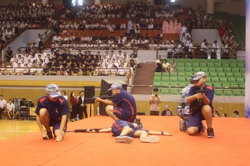 伴随着雄壮的音乐,64名中学生手执彩旗有序入场,瞬间围绕了整个场馆,随即,舞台上的7名部长带着各部的学生们进行了一段激情澎湃的宣誓,他们右拳紧握,表情肃穆,宣告着自己内心的誓言。一场场精彩绝伦的视听盛宴不断上演:一曲悦耳动听的《节日欢歌》伴随着优美的舞蹈,让人沉醉其中;身穿迷彩服手执冲锋枪的少年们谨慎地步入舞台,面对敌人他们毫不退却,淋漓尽致地展现了中华儿女不屈向上的精神风貌;小小少年们现场演绎经典名曲《hi,jude》,赢得台下阵阵掌声;中华经典轮番上阵,三字经、长亭外、锦瑟……极具中华历史气息;更有老师倾情朗诵,深度解释“和而共进、温暖前行”典礼主题。