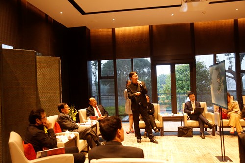 华茂希尔顿酒店业主代表忻国利向龙永图先生介绍东钱湖教育论坛项目
