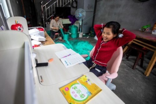 在妈妈的渔网“工作坊”旁,一张坑洼不平的饭桌便是波波伏案学习的“书桌”。由于屋内光线过暗,波波常揉着干涩的眼睛,蜷曲着身体趴在桌上学习。如今,新安置的学习桌不仅能通过调节“长高”,还有护眼台灯辅以照明,灯光不仅照亮了课本,也点亮了女孩的追梦之路。