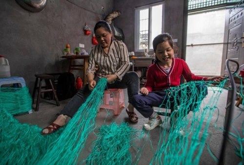 11岁女孩波波(化名)家住象山县石浦镇,在略显昏暗局促的家中,散布着一捆捆绿色渔网。自从女孩的父亲亡故后,母亲贺安敏(化名)便在家中编织渔网为生,为减轻家庭负担,波波也学会了“飞梭走线”的渔网编织手艺,经常写完作业后与妈妈一同“开工”。