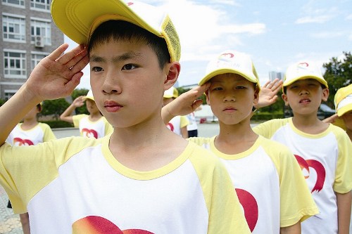 军训拓展时,168个孩子身着统一的黄色短袖,在炎热的太阳下整齐地集合,静静地等待着教官的命名下达。稍息、立正站好、向左转......随着教官的声声令下,孩子们开始了军事拉练。上午10时许气温闷热,豆大的汗珠从孩子们脸上划过,一张张晒红的小脸依旧不苟言笑,认真地保持着笔直的站立姿势。好在一场短暂而突然的暴雨临时打断了孩子们的拉练,躲雨的孩子们在教室里吃起了丰富的课间餐。雨停后,孩子们又重新返回操场,整齐口号声嘹亮,响彻整个校园。