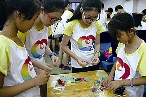 突如其来的新环境、新朋友,让“小候鸟”、“小主人”起初显得有些拘谨,不过女孩们总是很容易找个话题,变得熟络起来。在昨天下午的七色花手工劳技课上,聂軻的普通话不太好,在交流上显得有些吃力。一旁同是来自江西的聂梓怡就自告奋勇地当起了“小翻译”,一起做手工、一同嬉笑,让孩子们拉近了彼此的距离。