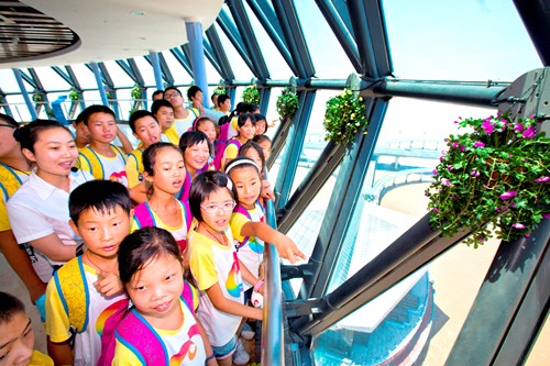 7月14日,为期8天的“华茂彩虹行动”暨“小候鸟”欢乐夏令营圆满结束,来自全国20多个省市的84名中小学生与父母一起度过欢乐时光。图为“小候鸟”参观杭州湾跨海大桥海天一洲。