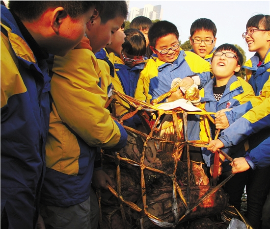昨天下午,宁波华茂外国语学校的“开心农场”里沸腾了,孩子们精心栽培了7个多月的番薯丰收了,有两个大番薯远远超出了大家的想象,一株单个的重130斤,另外一株有5个番薯,共重165斤,8个学生加两个大人也楞是抬它不起。