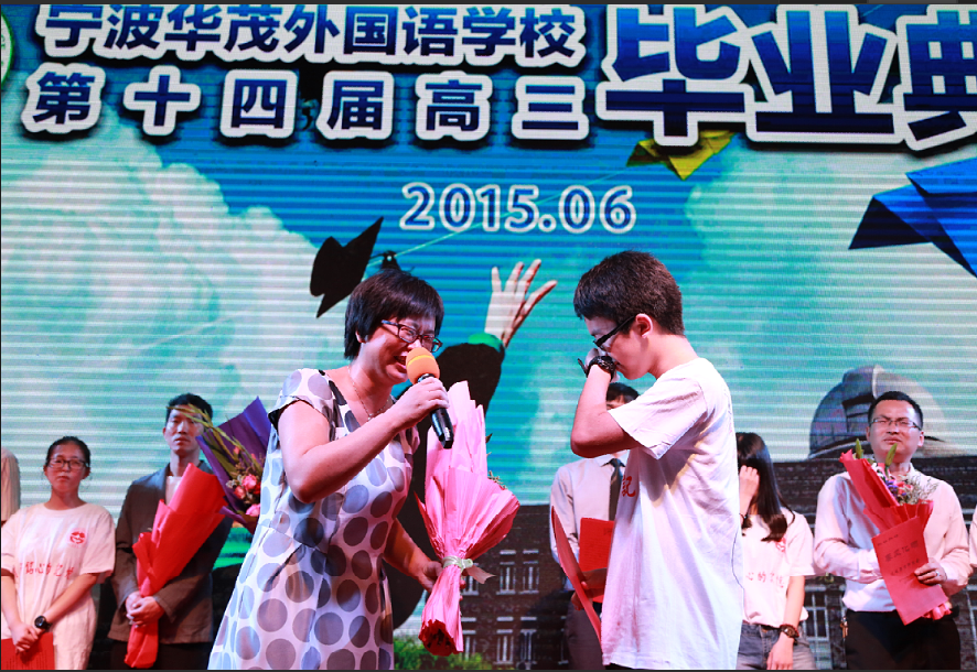 《东南商报》讯 昨天,在宁波华茂外国语学校毕业典礼上,高中毕业生手持百合花,深深鞠躬,对母校和辛勤陪伴自己多年的老师们,说出心中的感恩。在师生们用力的拥抱和一声声的叮咛中,毕业生们泪湿双眼。