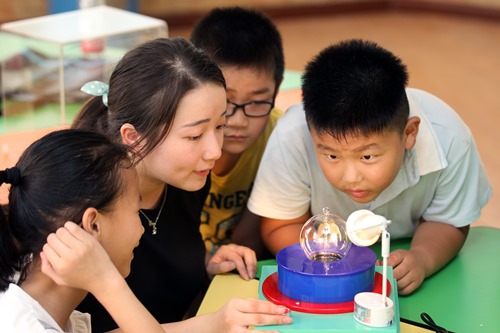 7月13日,孩子们走进浙江省宁波市象山县新桥镇“华茂·彩虹之家”科技科探实验室,在大学生志愿者指导下体验“光压风车”科学教具。日前,宁波华茂教育基金会在象山县创建3个“彩虹之家”,为留守儿童送上一份汇聚科学、充满趣味、拓宽视野的特别礼物,让孩子们在家门口就能玩上科学玩具,享受科技带来的神奇与快乐。